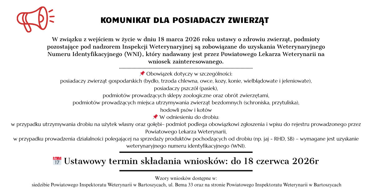 W związku z wejściem w życie w dniu 18 marca 2026 r. ustawy z dnia 21 listopada 2025 r. o zdrowiu zwierząt (Dz.U. 2025 poz. 1795), przypominamy o obowiązku zgłoszenia działalności do Powiatowego Lekarza Weterynarii w Bartoszycach oraz uzyskania weterynaryjnego numeru identyfikacyjnego (WNI).