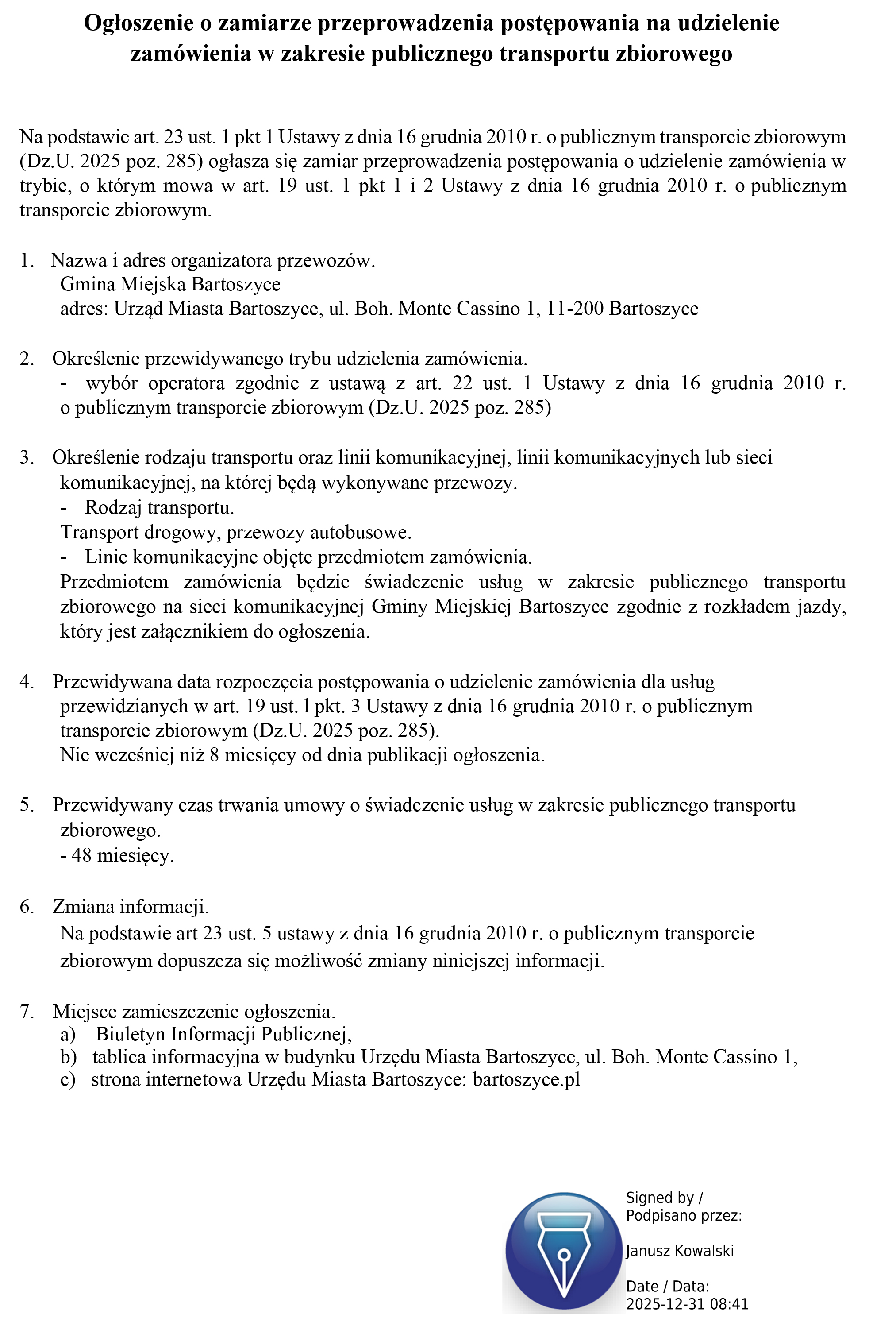 Ogłoszenie o zamiarze przeprowadzenia postępowania na udzielenie zamówienia w zakresie publicznego transportu zbiorowego