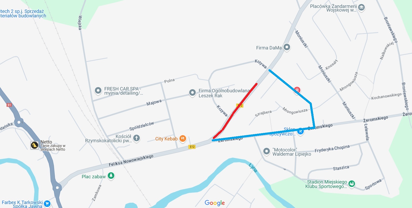 Generalny Wykonawca rozbudowy drogi wojewódzkiej nr 512 Przedsiębiorstwo Robót Drogowych Sp. z o.o. informuje, że od dnia 9.03.2026 r. do odwołania obowiązywał będzie zakaz ruchu na fragmencie ul. Nowowiejskiego – od budynku nr 33 do skrzyżowania z ulicami Krzywą i Teresy Bratek.